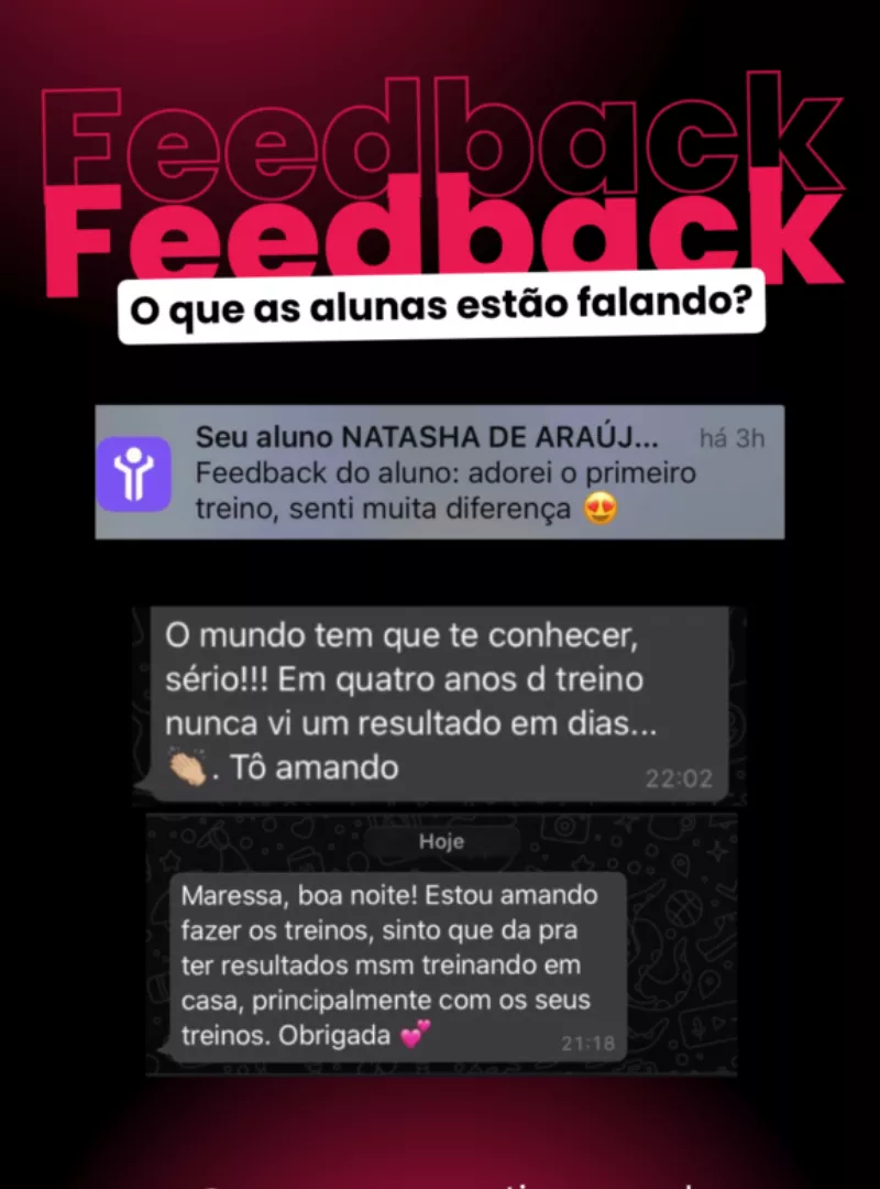 Com certeza, além de você ter todo acompanhamento através do aplicativo, também vai ter um suporte exclusivo no WhatsApp para tirar dúvidas sobre seus treinos e receber feedbacks.
